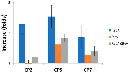 All seed treatments considerably increased RebA and RebA+Stev concentrations in leaves as compared to the control (Table 3). The increase in fold compared to the control is shown in Figure 3. CP treatments increased RebA concentration from 1.9- to 2.5-fold. CP5 induced the highest increase of RebA, Stev and RebA+Stev concentrations (2.5-, 1.6-, and 1.8-fold, respectively); however, the ratio of RebA/Stev was statistically increased only in the CP2 group.