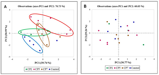 In the case of morphometric data combined with data of biochemical parameters (TPC, TFC and AA) (Figure 4B), the biplot dots from different treatment groups are scattered and do not form clusters. Therefore, distinct differences between the control and CP2, CP5 and CP7 groups cannot be determined. In the case of morphometric data combined with SG data (Figure 4A), the biplot dots form overlapping clusters with some outliers. This set of data indicates distinct differences between the control and treatment groups, especially for a longer duration of CP treatment.