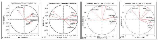 The correlation circles of the morphometric parameters and TPC, TFC and AA show similar patterns for CP5 and CP7 (Figure 6). Plant height and the number of leaves strongly negatively correlate with TPC in the control group, CP5 and CP7 treatment diminishes this correlation and induces a strong positive correlation of TPC with AA. A strong positive correlation of leaf mass with TFC was characteristic for all experimental groups.