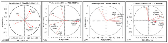 The correlation circles of the morphometric parameters (dry leaf mass, the number of leaves, plant height) and biochemical parameters (total phenolic content (TPC), total flavonoid content (TFC), antioxidant activity (AA) in stevia leaves) of the control group and treatment groups (CP2, CP5, and CP7).
