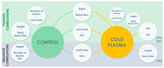 Stevia is a naturally cross-pollinated species; therefore, open-pollinated cultivars and cultigens are heterogeneous [39]. Therefore, the correlations of morphological traits which serve as important agronomic and economic traits with SGs and other bioactive secondary metabolites are useful for cultigen characterisation. For CP applications on stevia seeds for the improvement of plant biochemical composition, the correlations between different traits are of high predictive importance. Additionally, the positive effect on SGs and other metabolites should be balanced with economic traits (yield, disease resistance, etc.). These complex effects of CP in stevia have not been investigated. Some associations between traits are already determined in various cultigens, but the results are contradictory. RebA was negatively correlated with Stev [40,41] and dry leaf mass [42], but positively correlated with yield [41]. Some studies showed that the yield was also positively correlated with Stev [42], while other studies showed this correlation was negative [41,43]. We have determined (Figure 5) that in untreated (control) stevia plants, plant height strongly positively correlates with RebA and RebA/Stev, and the number of leaves strongly positively correlates with leaf mass. All CP treatments weaken the positive correlation of plant height with RebA and RebA/Stev, and the correlation of the number of leaves with leaf mass. A negative correlation of plant height with RebA+Stev was induced by CP2. A strong positive correlation of RebA with RebA/Stev, and a strong negative correlation of leaf mass with Stev were not influenced by CP treatment.