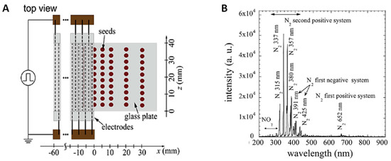Plasma irradiation of seeds was carried out by a scalable dielectric barrier discharge (DBD) device, described in more detail earlier [47,48,49] and shown in Figure 8A. For the device, 20 rods 2 mm in diameter and 60 mm long were placed as a planar shape with spacing of 0.2 mm. The rod electrode consisted of a stainless steel rod of 1 mm in diameter and a ceramic tube of 1 mm in inner diameter and of 2 mm in outer diameter. One layer of seeds (100 seeds) was placed under the electrode on the glass tray so that the distance from electrode and seed surface was 8 mm. Discharges were produced in the air between the gap of the electrodes by applying pulsed voltage of 7 kV (LHV-09K, Logy Electric Co. Ltd., Tokyo, Japan). The repetition frequency and the discharge power density were 14.4 kHz and 3.05 W/cm2, respectively, the total power was 4.64 W and the area of the plasma 1.52 cm2. The optical emission spectrum of plasma is shown in Figure 8B. Seeds were treated with DBD plasma at room temperature, and relative humidity of the air was kept at 50 ± 5% by applying an ultrasonic humidifier in the closed chamber where DBD plasma electrodes were placed. Based on some our previous studies on different plant seeds [26,27,29,50,51], the chosen duration for seed treatments was 2, 5 and 7 min (this treatment is further abbreviated as CP2, CP5 and CP7, respectively).