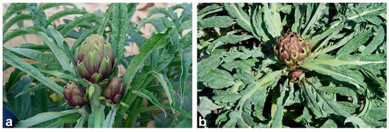 Artichoke biodiversity of late-flowering Apulian artichoke ecotypes (a) “Locale di Mola tardivo” and (b) “Troianella”.