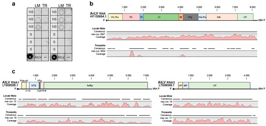Results from high-throughput sequencing (HTS) of three RNA preparations extracted from NS and S samples of the LM and TR ecotypes confirmed the absence of virus infection in S samples and the presence of ArLV and AILV infections in the NS, as already observed by dot blot hybridization (Figure 2 and Table S1).