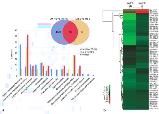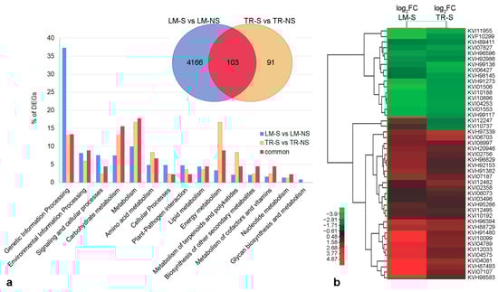 KEGG analysis was used for the functional annotation of DEGs. The results from the comparison of S vs. NS samples showed that about 92.2% and 85.7% of DEGs in LM (Table S2) and TR (Supplementary Table S3), respectively, were involved in genetic and environmental information processing, carbohydrate, protein, lipid and energy metabolisms, and cellular processes (Figure 3a). Additionally, in LM, 7.8% (142 genes) of DEGs were involved in the biosynthesis of other secondary metabolites, whereas only 14.3% (12 genes) of the genes related to this biosynthetic pathway were differentially expressed in TR (Figure 3a). Considering the 103 DEGs in common between LM and TR, only 45 genes were annotated. These genes were mainly involved in the control of the cell’s primary metabolisms and in the regulation of genetic information (84.4%), while the remaining 15.6% (5 genes) were annotated on secondary metabolism with a similar expression profile between LM and TR (Figure 3b and Table S4).