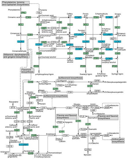 Schematic representation of secondary metabolite pathway map for phenylpropanoid, flavonoid, stilbenoid, diarylheptanoid, and gingerol biosynthesis. The positions in the map of the proteins encoded by the differentially expressed genes (DEGs) modulated in the LM and TR ecotypes, in the sanitized (S) vs. non-sanitized (NS) samples, are highlighted with blue boxes. The position of the proteins encoded by the DEGs observed only in the analysis between LM-S vs. LM-NS, is highlighted with green boxes. Protein abbreviations: 4CL, 4-coumaric acid:CoA ligase; ANS, anthocyanidin synthase; ANR, anthocyanidin reductase; C3H, p-coumaric acid 3-hydroxylase; C3′H, p-coumaroyl-shikimic acid/quinic acid 3-hydroxylase; C4H, cinnamic acid 4-hydroxylase; CAD, cinnamyl-alcohol dehydrogenase; CCoAOMT, caffeoyl-CoA O-methyltransferase; CCR1, cinnamoyl-CoA reductase 1; CHI, chalcone isomerase; CHS, chalcone synthase; COMT, caffeic acid 3-O-methyltransferase; CSE, caffeoyl shikimic acid esterase; CURS, curcumin synthase; CYP, flavonoid 3′-monooxygenase; CYPH, flavonoid 3′,5′-hydroxylase; DCS, phenylpropanoyl-diketide-CoA synthase; DFR, 5-deoxyleucopelargonidin:NADP+ 4-oxidoreductase; DHQT, caffeoyl-CoA:quinate O-(3,4-dihydroxycinnamoyl) transferase; F3H, flavanone,2-oxoglutarate:oxygen oxidoreductase; F5H, ferulic acid 5-hydroxylase; FDC1, ferulic acid decarboxylase; FLS, flavonol synthase; FNS, flavone synthase I; HCR, dihydro-4-coumaroyl-CoA:NADP+ 2,3-oxidoreductase; HST/HQT, hydroxycinnamoyl-CoA:shikimic/quinic acid hydroxycinnamoyltransferase; LAR, leucoanthocyanidin reductase; PAL, phenylalanine ammonia-lyase; PGT1, phlorizin synthase 1; POD, peroxidase; REF1, coniferyl-aldehyde dehydrogenase; STS, stilbene synthase; and TAL, tyrosine ammonia-lyase. The figure map was adapted from the KEGG database.