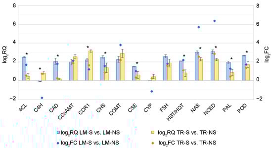 QPCR confirmed the up-regulation (log2RQ ≥ 1) of almost all DEGs of the secondary metabolite pathway in S plants compared to NS samples, except for C4H and CYP genes in LM-S samples, as already observed in transcriptome analysis (Figure 6). The genes 4CL, CAD, CHS, CSE, HST/HQT, NAS, NCED, PAL, and POD were significantly more expressed in LM compared to TR samples, while C4H and CCR1 were significantly more expressed in TR samples compared to LM.