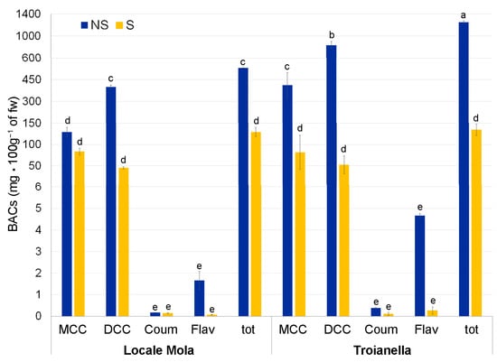 A detailed comparison of the BAC chromatograms of S and NS samples in the two ecotypes showed a similar profile of the identified and most accumulated phytochemical compounds in the two conditions (Figure S3) although about 1% more unknown peaks were recorded in the S than in NS samples (Figure S4).