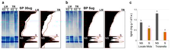 Analysis of artichoke peroxidase activity and lignin content accumulation in Locale di Mola (LM) and Troianella (TR) artichoke samples. Native-PAGE of (a) 30 μg of soluble (SP) fraction and (b) 5 μg of bound (BP) protein fraction of the LM and Troianella TR ecotypes. POD activity assay staining of gels was analyzed by ImageJ software to compare POD activity in non-sanitized (NS, black profile) and sanitized (S, red profile) plants. The histogram shows (c) lignin content in each condition tested. Letters indicate statistically significant differences for p ≤ 0.05 performing a Tukey post hoc ANOVA test.