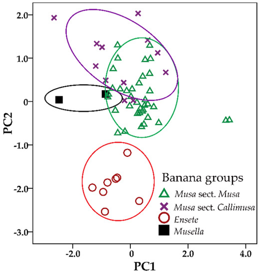The multivariate analysis of the 15 male floral morphological characters did not separate the genus Musa at sectional level, whereas the molecular phylogeny clearly divided the genus into two sections: Musa + Rhodochlamys and Callimusa + Australimusa [6,7,30].
