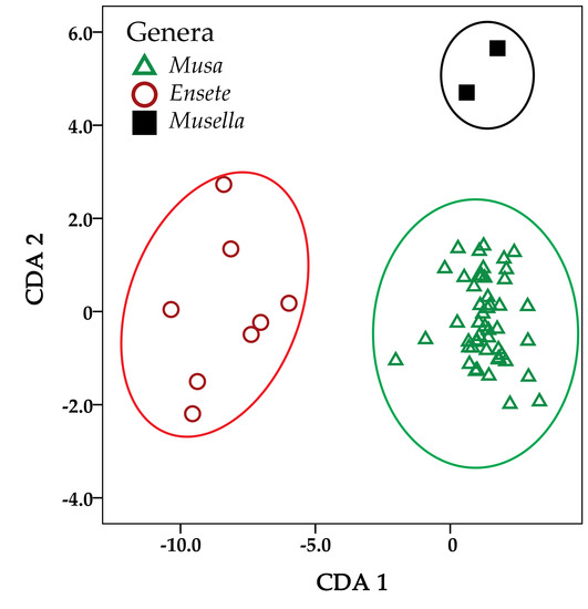 Canonical Discriminant Analysis (CDA) provided 100% of the variation between the three genera in the first two dimensions (Table 3, Figure 2). The results of the CDA indicated that the characters most significantly separated flowers of Ensete from Musa and Musella were, i.e., length from style base to stigma head, width of ovary, length of median inner tepal, length of filament and length of ovary (Table 4—Function 1). The characters that separated Musella from Ensete and Musa includes length of compound tepal, length of anther, width of lateral outer compound tepal lobe, width of compound tepal, length of inner compound tepal lobe, width of central outer compound tepal lobe, width of inner compound tepal lobe, length of central outer compound tepal lobe and width of median inner tepal (Table 4—Function 2).