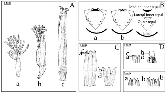 Compound tepal morphologies comparison and character state between Musaceae (character no. 1–8), (A) shape of perianth: (a) fused tepal with deep lobes; (b) ventricose; (c) tubular, (B) symmetry of flower: (a) bilateral symmetry; (b) radial symmetry, (C) shape of tepal lobe: (a) acute outer tepal apex lobes; (b) round outer tepal apex lobes; (c) ovate lateral inner tepal lobes; (d) acicular lateral inner tepal lobes, (D) spine-like dorsal appendage on outer tepal lobe: (a) absent on lateral outer tepal lobes; (b) present on lateral outer tepal lobes; (c) absent on median outer tepal lobes; (d) present on median outer tepal lobes, (E) spine-like dorsal appendage on lateral inner tepal lobes: (a) absent; (b) present.