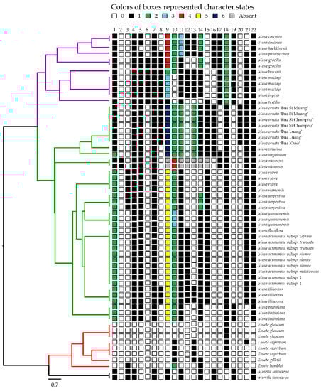 - Maddison, W.P.; Maddison, D.R. Mesquite: A Modular System for Evolutionary Analysis, Version 3.6. 2018. Available online: http://www.mesquiteproject.org/ (accessed on 26 September 2019).