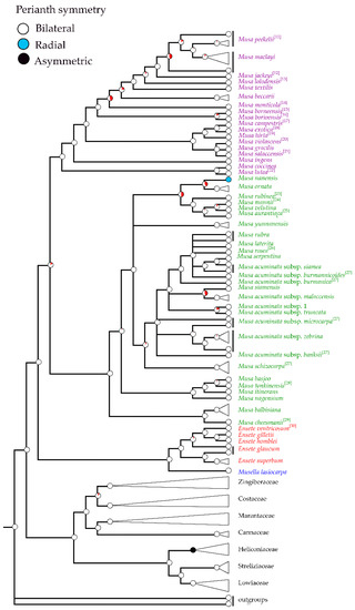 Ancestral state reconstruction, based on Bayesian posterior probabilities of selected morphological states on Bayesian topology constructed from nrDNA and plastid combined data. The tree shows the evolution of the perianth symmetry in the order Zingiberales with emphasis on Musaceae. The phylogenetic relationship included the families within Zingiberales (Musaceae, Strelitziaceae, Lowiaceae, Heliconiaceae, Costaceae, Cannaceae, Marantaceae and Zingiberaceae). The tree separated banana clades including Musella (blue), Ensete (red), species of sect. Musa (green) and species of sect. Callimusa (purple). Circles on nodes show character changes between the taxa, red pie represent node absent. Morphological characters from other publications were labeled with reference number [11,12,13,14,15,16,17,18,19,20,21,22,23,24,25,26,27,28,29,30].