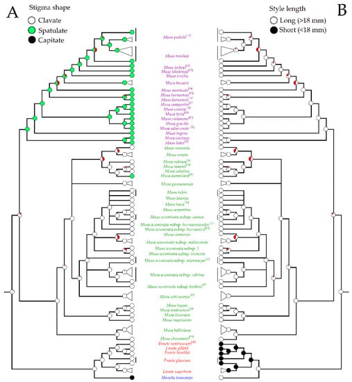 Phylogenetic trees of Musaceae based on the stigma shapes (A) and the style lengths (B) of male flowers. The trees show ancestral state reconstruction based on Bayesian posterior probabilities of selected morphological states on Bayesian topology constructed from nrDNA and plastid combined data. The tree separated banana clades including Musella (blue font), Ensete (red font), species of the sect. Musa (green font) and species of the sect. Callimusa (purple font). Circles on nodes show character changes between the taxa, red pies represent node absent and gray pie represent equivocal. Morphological characters from other publications were labeled with reference number [11,12,13,14,15,16,17,18,19,20,21,22,23,24,25,26,27,28,29,30].
