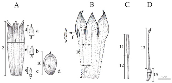 Quantitative characters of banana flowers. (A), Perianth of bilateral flower of banana including (a) lateral outer tepal, (b) median outer tepal, (c) later inner tepal and (d) median inner tepal (free tepal) of all Musaceae except M. nanensis, (B), perianth of M. nanensis that (f) median inner tepal fused with perianth tube, (C), stamen and (D,) pistil, i.e., 1. width of fused tepal, 2. length of fused tepal, 3. width of lateral outer tepal lobe, 4. length of median outer tepal lobe, 5. width of central outer tepal lobe, 6. length of central outer tepal lobe, 7. width of inner tepal lobe, 8. length of inner tepal, 9. width of median inner tepal, 10. length of median inner tepal, 11. length of anther, 12. length of filament, 13. length from style base to stigma head, 14. width of ovary, 15. length of ovary. Scale bar = 1 cm.