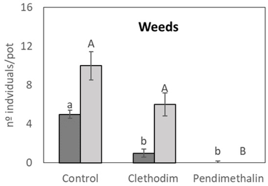 Individual number of weeds per pot, differentiating between monocotiledoneae (dark grey bars) and dicotiledoneae (clear grey bars) in a controlled chamber study in Granada, Spain, in January 2020. Data are mean + SE (n = 6). Mean values followed by similar lowercase (monocotyledoneae) or capital (dicotyledoneae) letters do not differ (p ≤ 0.05) using Tukey’s post hoc test.