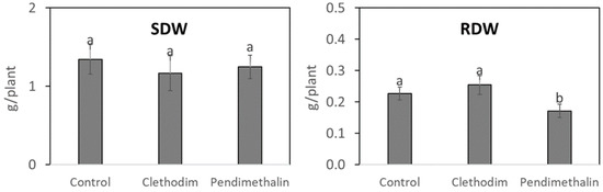 Shoot dry weight (SDW) and root dry weight (RDW) of P. vulgaris plants treated with clethodim and pendimethalin individually in a controlled chamber study in Granada, Spain, in January 2020. Data are mean + SE (n = 6). Mean values followed by the same letter do not differ (p ≤ 0.05) using Tukey’s post hoc test.