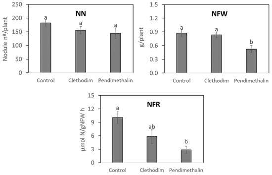Nodule number (NN), nodule fresh weight (NFW), and nitrogen fixation rate (NFR) of P. vulgaris plants treated with clethodim and pendimethalin individually in a controlled chamber study in Granada, Spain, in January 2020. Data are mean ± SE (n = 6). Mean values followed by the same letter do not differ (p ≤ 0.05) using Tukey’s post hoc test.