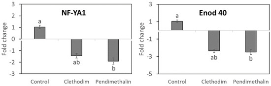 Expression of P. vulgaris genes related to rhizobial infection (NF-YA1) and early nodulation in roots (Enod 40) inoculated with Rhizobium tropici. P. vulgaris plants treated with clethodim and pendimethalin individually in a controlled chamber study in Granada, Spain, in January 2020. The ubiquitin UBC9 was used to normalize gene expression. When ratio values were lower than 1, the inverse value was estimated, and the sign was changed. Data are the mean ± SE (n = 3) in a single qRT-PCR experiment. Mean values followed by the same letter do not differ (p ≤ 0.05) using Tukey’s post hoc test.