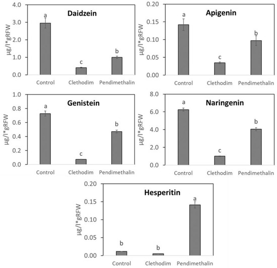 The effect of clethodim and pendimethalin on the composition of root exudates in terms of flavonoids and organic acids was analyzed in order to determine possible alterations in the recognition of the symbionts and, therefore, in the symbiosis establishment. The concentrations of different compounds were expressed per gram of root biomass, considering possible reductions of this parameter produced by the herbicides. Among the different flavonoids detected, naringenine and daidzein were the most abundant, followed by genisteine, apigenine, and hesperitine. In general, clethodim strongly reduced the presence of flavonoids in the root exudates: from 50% for hesperitin to 90% for genistein (Figure 5). Pendimethalin also inhibited the exudation of most of the flavonoids analyzed, although in that case, the inhibition range oscillated between about 70% for daidzein and around 30% for apigenin and naringenin. Hesperitin was the only flavonoid whose concentration increased 14-fold in response to pendimethalin, compared with control plants.