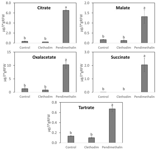 Content of organic acids in root exudates of P. vulgaris plants treated with clethodim and pendimethalin individually in a controlled chamber study in Granada, Spain, in January 2020. RFW = root fresh weight. Data are mean ± SE (n = 6). Mean values followed by the same letter do not differ (p ≤ 0.05) using Tukey’s post-hoctest.