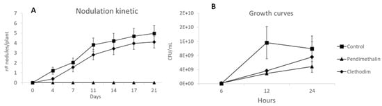 (A) Nodulation kinetic of Medicago sativa plants inoculated with Sinorhizobium meliloti (1021) treated with Clethodim and Pendimethalin in an in vitro study at Granada, Spain, in 2020. Data are mean + SE (n = 30). (B) Growth curves of Sinorhizobium meliloti (1021) grown in TY medium containing clethodim and pendimethalin. CFU = Colony-Forming Units. Data are mean ± SE (n = 3).