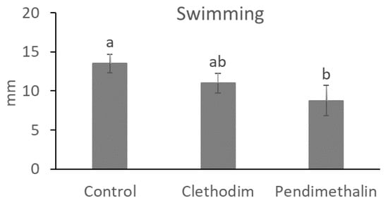 Swimming motility diameter of Sinorhizobium meliloti (1021) growth with clethodim and pendimethalin in 0.3% water-agar medium in an in vitro study at Granada, Spain, in 2020. Data are mean ± SE (n = 3). Mean values followed by the same letter do not differ (p ≤ 0.05) using Tukey’s post hoc test.