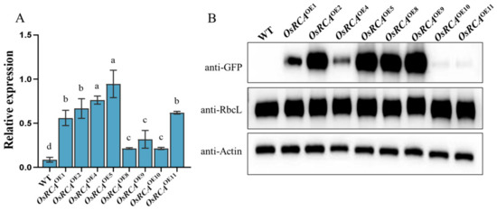 Figure 1. Molecular characterization of WT and OsRCAOE lines. (A) OsRCA mRNA abundance. The different letters indicate significant differences at p < 0.05. (B) OsRCA–GFP and RbcL protein expression. Anti–actin acted as an internal control to correct protein quantification. The fusion protein and RbcL protein were detected with Western blotting using anti–GFP and anti–RbcL.
