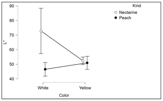 Two-way ANOVA showed that L* exhibits a significant interaction between pulp color (white vs. yellow) and types of fruit (peaches vs. nectarines). Figure 2 showed that the difference between the mean L values in white and yellow fruits is much stronger in nectarines than in peaches, with an opposite sign.