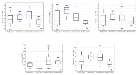 Box plots for sugars content of different types of peaches and nectarines fruits: (a) sucrose content; (b) glucose content; (c) fructose content; (d) sorbitol content; (e) total sugars. The central line displays the median, the bottom and top of the box are the first and third quartiles, respectively.