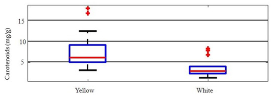 Box plots for total carotenoid contents (mg g−1) of yellow- and white-flesh fruits. The central line displays the median, the bottom and top of the box are the first and third quartiles, respectively.