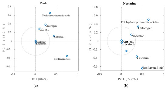 The values of peach and nectarine phenolic content were analyzed separately by PCA analysis. The results revealed a maximum of three principal components (PCs), and PC1 and PC2 explained over 90% of the variance in the datasets for both peaches and nectarines. PC1 exceeded 83% of variance in peaches and 70% in nectarines, whereas PC2 explained 21% and 11% of the variance in nectarines and peaches, respectively (Figure 5). In peaches, PC1 is dominated by catechins, while hydroxycinnamic acids have stronger loads on PC2. In nectarines instead, catechin and neochlorogenic acid and chlorogenic acid have similar loads along either PC1 or PC2.
