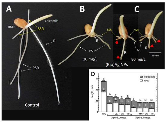 The morphology of 3-day-old seedlings of wheat (Triticum aestivum L. cv. Ostka Strzelecka) developing in the absence (A) or presence of (Bio)Ag NPs (at (B) 20 or (C) 80 mg/L). The browning root tips are indicated by red arrows. Abbreviations: R—radicle, PSR—primary seminal roots, SSR—secondary seminal roots. The inhibition of seedling growth (elongation of radicle and coleoptile) by (Bio)Ag NPs alone (at 20 and 80 mg/L) and in mixtures with cyclitols (+MIN, +DCI, +PIN) is shown in (D) (values are means (n = 3) + SD, and bars with the same letters (a–c) were not significantly (p < 0.05) different after ANOVA test and Tukey’s post hoc corrections).