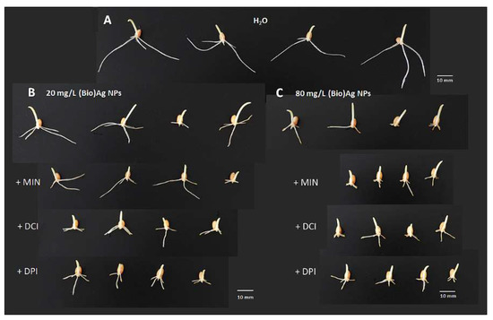 The morphology of 3-day-old seedlings of wheat (Triticum aestivum L. cv. Ostka Strzelecka) growing in the absence (A) or presence of (Bio)Ag NPs alone (at (B) 20 and (C) 80 mg/L) and in mixtures with cyclitols—myo-inositol (+MIN), d-chiro-inositol (+DCI) or d-pinitol (+PIN)—at 100 mM concentration each (B,C). Horizontal white bars correspond to 10 mm.
