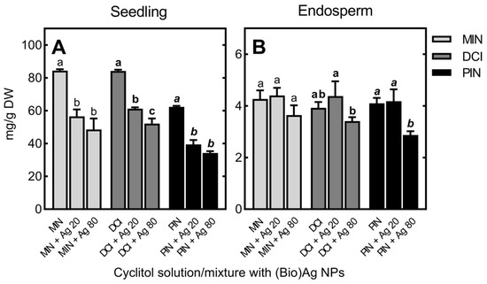 In the seedlings, cyclitol contents decreased when increasing concentrations of (Bio)Ag NPs were used to imbibe wheat seeds (Figure 3A). In the endosperm, decreases in DCI and PIN contents were found only at higher concentrations of (Bio)Ag NPs (80 mg/L; Figure 3B).