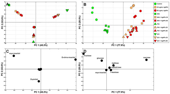 Principal component analysis (PCA) of soluble carbohydrate profiles (with (A) and without (B) exogenous cyclitols) of wheat seedlings grown in water (control), solutions (green symbols) of myo-inositol (MIN), d-pinitol (PIN) and d-chiro-inositol (DCI) and mixtures of cyclitols (at 100 mM each) with (Bio)Ag NPs at 20 and 80 mg/L (orange and red symbols, respectively). Symbols: circles—control samples and those treated with (Bio)Ag NPs only, squares—samples treated with MIN and MIN + Ag NPs, triangles— samples treated with PIN and PIN + Ag NPs, inverted triangles—samples treated with DCI and DCI + Ag NPs. The PCA loading plots of the soluble carbohydrates are shown in figures (C,D).