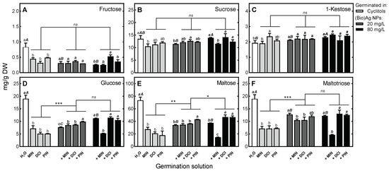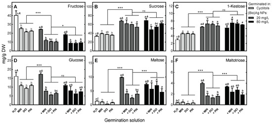 This effect was not related to the concentration of (Bio)Ag NPs applied or to the presence of DCI or PIN. In contrast, the addition of MIN to (Bio)Ag NPs (at a concentration of 80 mg/L) reduced the concentrations of sucrose, glucose, maltose and maltotriose (Figure 6B,D–F).