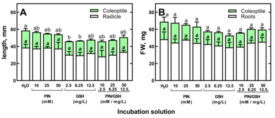 Furthermore, the application of mixtures of PIN and GSH had no effect on early seedlings’ growth (Figure 7). Thus, the use of PIN, GSH and their mixture at the highest concentrations examined (50 mM PIN and 12.5 mg/L GSH) to prevent the phytotoxicity of (Bio)Ag NPs is reasonable. However, the addition of PIN, GSH and their mixtures to a suspension of (Bio)Ag NPs did not reduce the toxicity of (Bio)Ag NPs to developing wheat seedlings (Figure 8A).