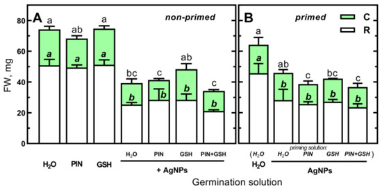 (A) The effects of PIN (50 mM), GSH (12.5 mg/L) and (Bio)Ag NPs (at 40 mg/L) alone and in mixtures of PIN, GSH and PIN plus GSH on the fresh weight (FW) of roots (R, including scutellum) and coleoptiles (C) of 3-day-old seedlings of wheat (Triticum aestivum L. cv. Collada). (B) The effects of wheat grains priming in H2O, PIN, GSH and mixtures of PIN and GSH on the FW of roots and coleoptiles of 3-day-old seedlings of wheat developing in H2O or (Bio)Ag NPs (at 40 mg/L). Values are means (n = 3) + SD. Bars with the same letters (a–c) were not significantly (p < 0.05) different after ANOVA test and Tukey’s post hoc corrections.