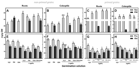 Roots and coleoptiles of wheat seedlings also accumulated sucrose (Figure 9A,B). A similar reaction was revealed in seedlings developing from primed grains (Figure 9C,D). The increase in sucrose content coincided with a decrease in fructose and glucose (Figure 9E–H). Similar changes were also found in the endosperm (Figure S1). Seedlings from non-primed grains developed in PIN and GSH without (Bio)Ag NPs accumulated less sucrose than those in the presence of (Bio)Ag NPs (Figure 9). The addition of PIN and GSH to (Bio)Ag NPs reduced sucrose accumulation in roots (Figure 9A).