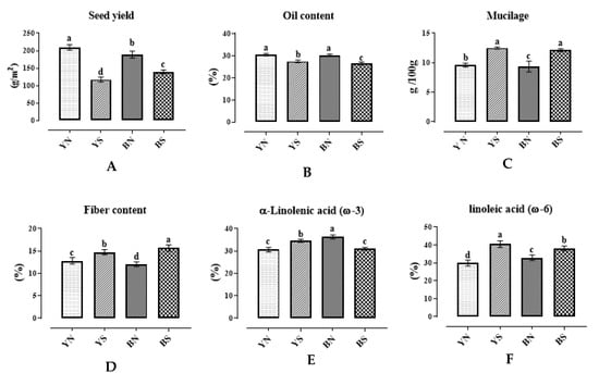 Diagrams of seed yield (A), oil content (B), mucilage (C), fiber content (D), α- Linolenic acid (omega-3) (E), and linoleic acid (omega-6) (F) extracted from flax families under water stress and normal irrigation conditions. A same letter above the columns for each trait (diagram) indicates that the values are not statistically different (p > 0.05). Values are mean ± standard error. Letters y, b, n, and s denote yellow color, brown color, normal conditions, and water stress conditions, respectively.