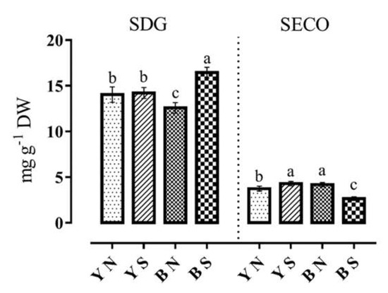 The SECO is a precursor converted to SDG in a process with an unknown path. A comparison of SECO values showed that its highest amount was observed in brown-seeded families in normal moisture conditions. Under water stress conditions, the highest amount of SECO was detected in yellow-seeded families, while the lowest amount of SECO was also observed in brown-seeded families (Figure 3).