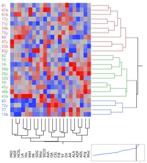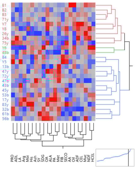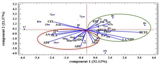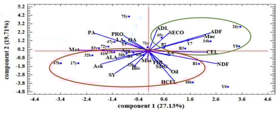The results of principal component analysis under water stress conditions showed that the first two components explained more than 46.84% of the variance (Figure 5). The first principal component (PC1) had a positive and high correlation with Muc, ADF, CEL, and NDF and negatively correlated with Met, LA, and Arg. The second principal component (PC2) had a positive high correlation with ADL, SECO, and PRO and negatively correlated with SDG, FIB, HCEL, SY, and oil. The positive value of the first component symbolized high mucilage and fiber, and the negative value of the second component symbolized a lower value of SY, oil, and SDG. Therefore, the families in the fourth quarter circle, including 26y, 34b, 45y, B3, Y8, and B2, had the highest amount of mucilage, SECO, and CEL and the lowest amount of SY, oil, and SDG. In contrast, the families that were in the circle of the first quarter, including 17y, 53b, 32b, 43b, 48b, 47b, and 56b, had the highest SY, oil, FIB, and SDG and the lowest amount of SECO and mucilage under water stress conditions (Figure 5).
