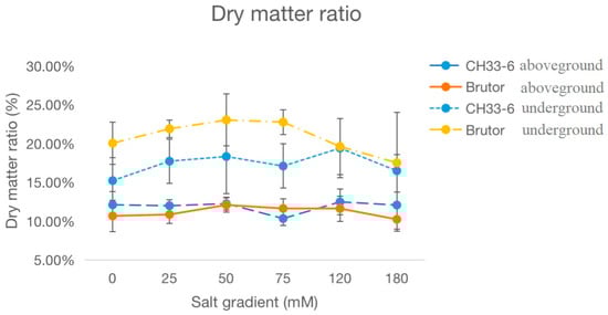 The above- and underground dry matter ratios were also calculated for the seedlings at the early flowering stage under the treatment of six different salinity levels (Figure 2). In both varieties, the underground dry matter ratios first increased, reaching a relatively higher level at 50 mmol L−1 NaCl, then decreased along with the increase in salt concentration. However, the aboveground dry matter ratios were less affected by the different NaCl concentrations tested in the two varieties.