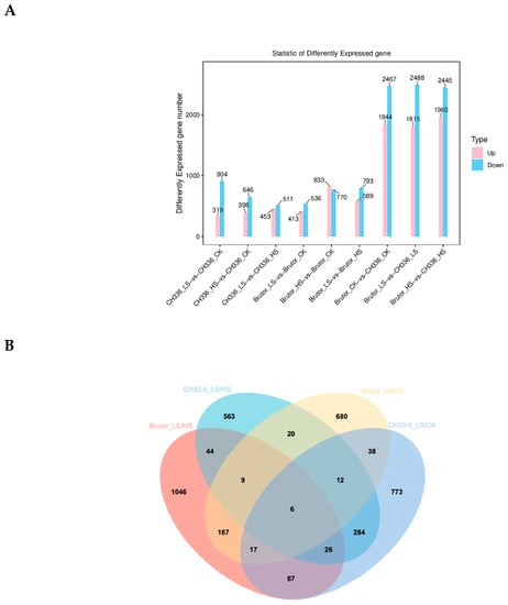 Statistical charts of the differentially expressed genes (DEGs) in two Brassica napus varieties (CH336 and Brutor) under control (CK, 0 mmol L− 1 NaCl), low salt (LS, 25 mmol L− 1 NaCl), and high salt (HS, 180 mmol L− 1 NaCl) stress conditions. (A). The column charts of DEGs in each comparison group. The pink and light blue colors indicate the up- and down-regulated DEGs, respectively. The numbers in the column refer to the DEG amounts in each comparison group. (B). Venn diagram showing the number of unique and common DEGs in both varieties.