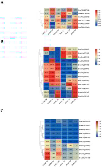 FPKM(−normalized heatmaps of some candidate differentially expressed genes (DEGs) potentially involved in stimulating the seedling growth under moderate salinity stress in Brassica napus. (A). Six DEGs commonly shared between LS/CK and LS/HS and with similar expression patterns in two oilseed rape varieties (CH336 and Brutor). (B). 13 B. napus DELLA family genes. (C). 10 B. napus MYB46 genes.
