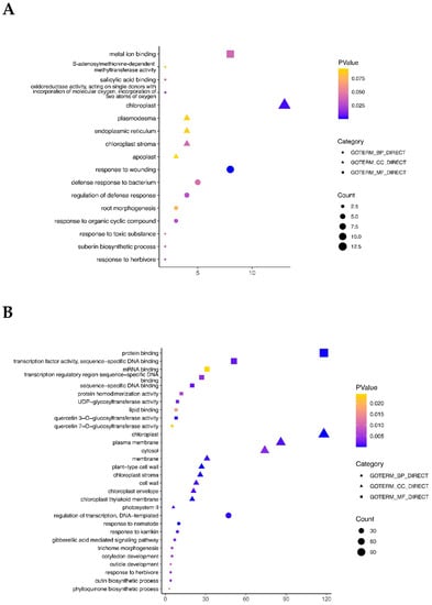GO enrichment analysis of differentially expressed genes (DEGs) identified between low salt (LS) treatment and no salt control (CK) in two Brassica napus varieties (CH336 and Brutor). (A). GO terms of DEGs in the COMMON_LS/CK group. (B). GO terms of up-regulated DEGs in the TOTAL_LS/CK group. (C). GO terms of down-regulated DEGs in the TOTAL_LS/CK group. The square, triangle, and circle indicate the molecular function (MF), cellular component (CC), and biological process (BP) GO categories, respectively. The pattern size means the number of DEGs enriched in each term. The different pattern colors refers to different p-values of for the enriched GO terms.