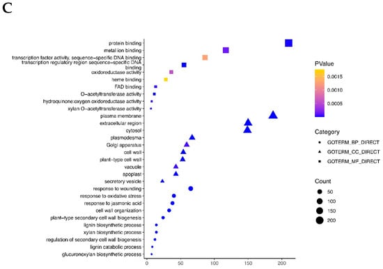 A total of 17 GO terms were enriched in the COMMON_LS/CK group, 110 GO terms in the up-regulated DEGs (by the LS treatment) of the TOTAL_LS/CK group, and 153 GO terms in the down-regulated DEGs (by the LS treatment) of the TOTAL_LS/CK group. The top 10 GO terms of these three categories are presented in Figure 5. In the COMMON_LS/CK group, the terms such as metal ion binding (biological process, BP), chloroplast (cellular component, CC), and response to wounding (molecular function, MF) were significantly enriched (Figure 5A). In the up-regulated DEGs in the TOTAL_LS/CK group, the terms such as protein binding, transcription factor activity, sequence-specific DNA binding (MF), chloroplast, plasma, cytosol, and chloroplast-related terms such as chloroplast stroma, chloroplast envelope and chloroplast thylakoid membrane (CC), regulation of transcription, and DNA-templated (BP) were highly enriched (Figure 5B). In the down-regulated DEGs of the TOTAL_LS/CK group, the terms such as protein binding and metal ion binding (MF), plasma membrane, extracellular region and cytosol (CC), response to wounding, plant−type secondary cell wall biogenesis, the lignin biosynthetic process, and the xylan biosynthetic process (BP) were enriched (Figure 5C).