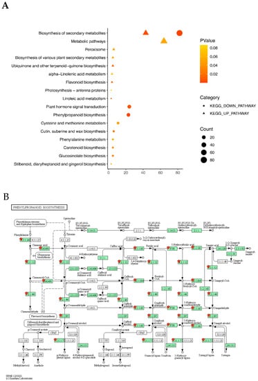 KEGG pathway enrichment analysis of differentially expressed genes (DEGs) identified between low salt (LS) treatment and no salt control (CK) in two Brassica napus varieties (CH336 and Brutor). (A). KEGG pathways of DEGs in TOTAL_LS/CK group. The triangle and circle indicate the up- and down-regulated KEGG pathways, respectively. The pattern size means the number of DEGs enriched in each pathway. The different pattern colors refers to different p-values for the enriched pathways. (B). The phenylpropanoid biosynthesis pathway. The DEGs involved in the pathway are marked by red stars.